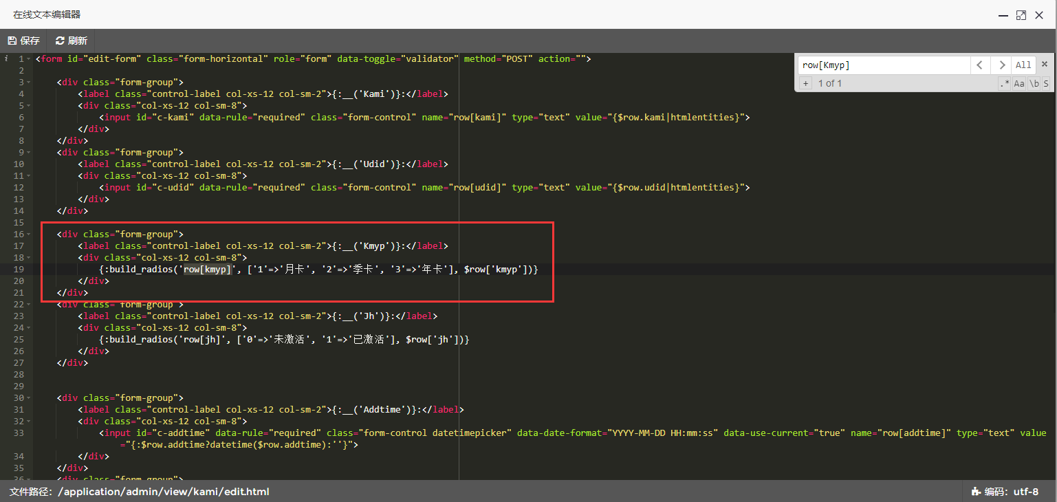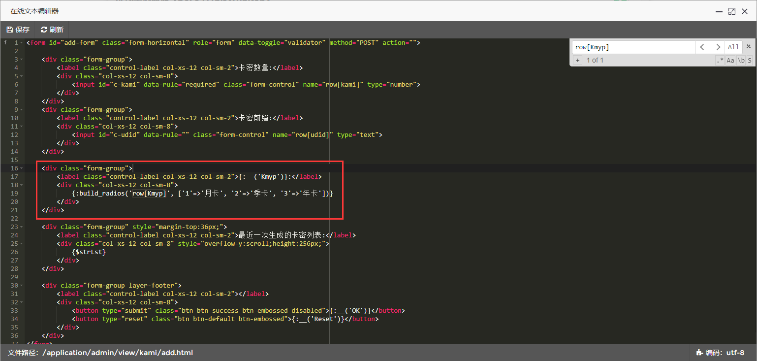 {:build_radios('row[Kmyp]', ['1'=>'月卡', '2'=>'季卡', '3'=>'年卡', '4'=>'永久卡'])}(3)打开源码目录:application/admin/view/kami