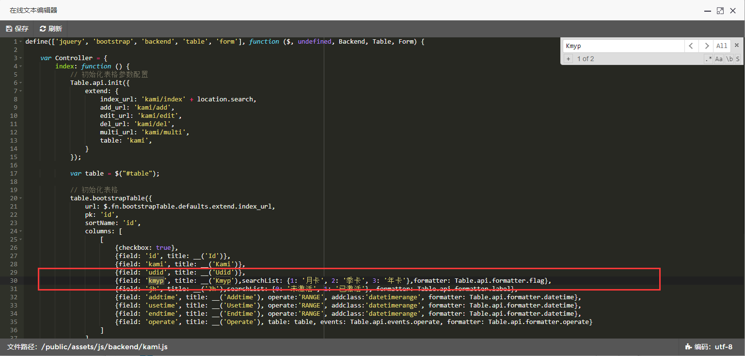 {:build_radios('row[kmyp]', ['1'=>'月卡', '2'=>'季卡', '3'=>'年卡', '4'=>'永久卡'], $row['kmyp'])}(4)打开源码目录:public/assets/js/backend